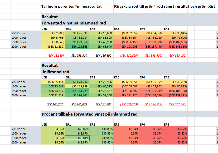 Under den andra rubriken "Resultat inlämnad rad" kan ni också se hur "slumpen" slår. Tittar ni i kolumnen för ER1 och 1000 rader så ser ni att resultatet för den verkliga inlämnade raden har ett minus på 19 839 kr medan ifall ni tittar i kolumnen nedan med 1500 rader så visar den en gigantisk vinst på 113 229 kr. Den ena visar alltså en förlust medans den andra en stor vinst trots att den förväntade vinsten i båda fallen var exakt den samma.