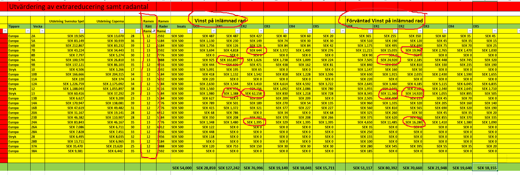 Jag har ringat in lite vinster för att visa hur standardvariationen slår både positivt och negativt. De inringade vinsterna i den högra kolumnen är förväntad vinst på inlämnad rad och den vänstra är den verkliga vinsten på samma inlämnade rad. Observera att den förväntade vinsten kan vara ganska stor men att den verkliga vinsten blir ganska liten om man inte får 13 rätt men också att tvärtom gäller. Vi hade t.e.x en "verklig" vinst på 102 897 kr med ER1 när vi bara hade en förväntad vinst på 14 920 kr och det berodde på att 13 rätt hade turen att slå. Ingen av de 7 gånger vi har haft alla rätt inom ramen i år så har det slagit väl ut och det hade förmodligen räckt att det bara gjort det en gång för att vi skulle hamna på plus.
